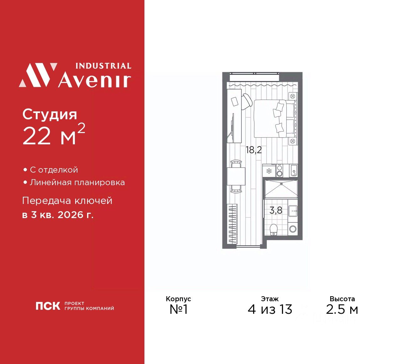 Просторные 1-комн. апартаменты-студия с отделкой в ЖК "Industrial AVENIR" на 4 этаже. Общая площадь: 22 кв.м., площадь гостиной 18.2 кв.м., из которых 5 кв.м. выделено под кухонную зону. Все окна выходят на одну сторону. В апартаментах один совмещенный санузел. Высота потолков 2.5 м.