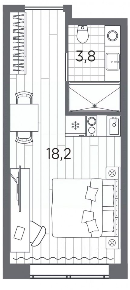 Просторные однокомнатные апартаменты-студия с отделкой в ЖК "Industrial AVENIR" на 4 этаже. Общая площадь: 22 кв.м., площадь гостиной 18.2 кв.м., из которых 5 кв.м. выделено под кухонную зону. Все окна выходят на одну сторону. В апартаментах один совмещенный санузел. Высота потолков 2.5 м.