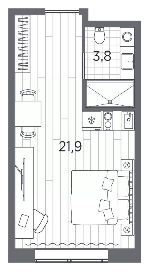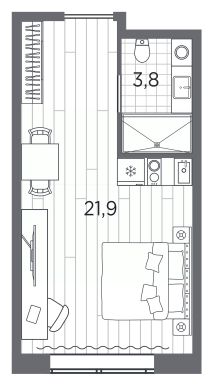 1-комн. апартаменты-студия с отделкой в ЖК "Industrial AVENIR" на 4 этаже. Общая площадь: 25.7 кв.м., площадь гостиной 21.9 кв.м., из которых 5 кв.м. выделено под кухонную зону. Все окна выходят на одну сторону. В апартаментах один совмещенный санузел. Высота потолков 2.5 м.