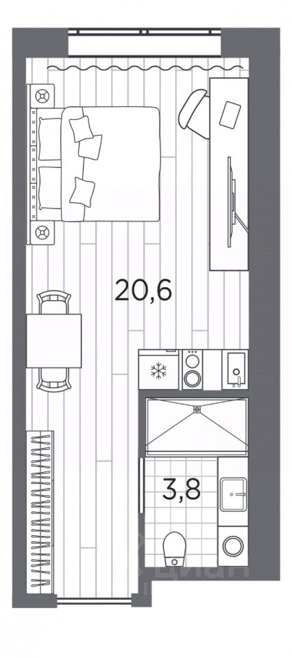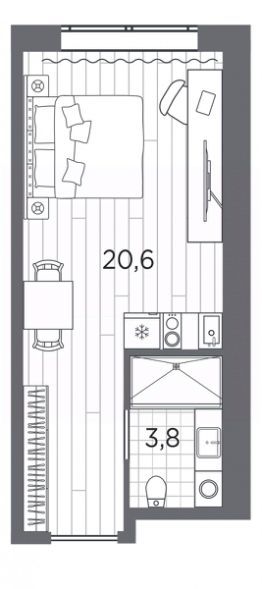 1-комн. апартаменты-студия от застройщика с отделкой в ЖК "Industrial AVENIR" на 6 этаже. Общая площадь: 24.4 кв.м., площадь гостиной 20.6 кв.м., из которых 5 кв.м. выделено под кухонную зону. Все окна выходят на одну сторону. В апартаментах один совмещенный санузел. Высота потолков 2.5 м.