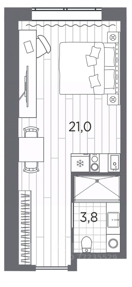Просторные 1-комн. апартаменты-студия с отделкой в ЖК "Industrial AVENIR" на 6 этаже. Общая площадь: 24.8 кв.м., площадь гостиной 21 кв.м., из которых 5 кв.м. выделено под кухонную зону. Все окна выходят на одну сторону. В апартаментах один совмещенный санузел. Высота потолков 2.5 м.
