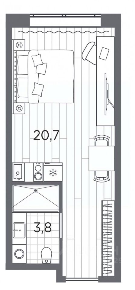 Продаются 1-комн. апартаменты-студия от застройщика с отделкой в ЖК "Industrial AVENIR" на 6 этаже. Общая площадь: 24.5 кв.м., площадь гостиной 20.7 кв.м., из которых 5 кв.м. выделено под кухонную зону. Все окна выходят на одну сторону. В апартаментах один совмещенный санузел. Высота потолков 2.5 м.