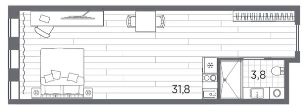 1-комн. апартаменты-студия с отделкой в ЖК "Industrial AVENIR" на 8 этаже. Общая площадь: 35.6 кв.м., площадь гостиной 31.8 кв.м., из которых 5 кв.м. выделено под кухонную зону. Все окна выходят на одну сторону. В апартаментах один совмещенный санузел. Высота потолков 2.5 м.