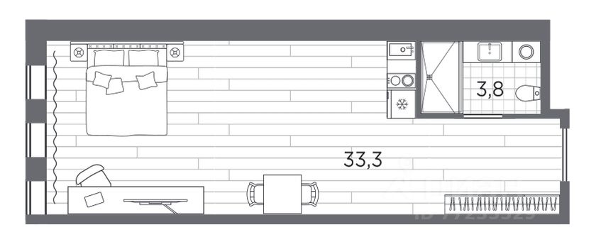 1-комн. апартаменты-студия с отделкой в ЖК "Industrial AVENIR" на 8 этаже. Общая площадь: 37.1 кв.м., площадь гостиной 33.3 кв.м., из которых 5 кв.м. выделено под кухонную зону. Все окна выходят на одну сторону. В апартаментах один совмещенный санузел. Высота потолков 2.5 м.