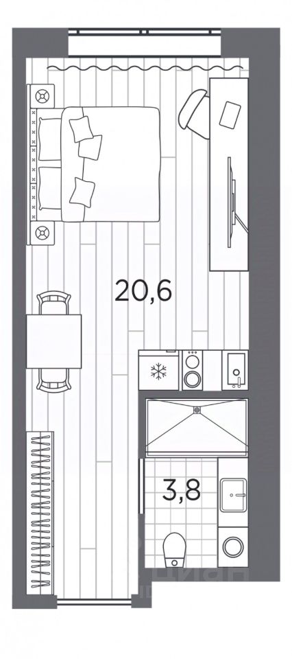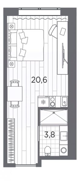 Просторные однокомнатные апартаменты-студия с отделкой в ЖК "Industrial AVENIR" на 8 этаже. Общая площадь: 24.4 кв.м., площадь гостиной 20.6 кв.м., из которых 5 кв.м. выделено под кухонную зону. Все окна выходят на одну сторону. В апартаментах один совмещенный санузел. Высота потолков 2.5 м.