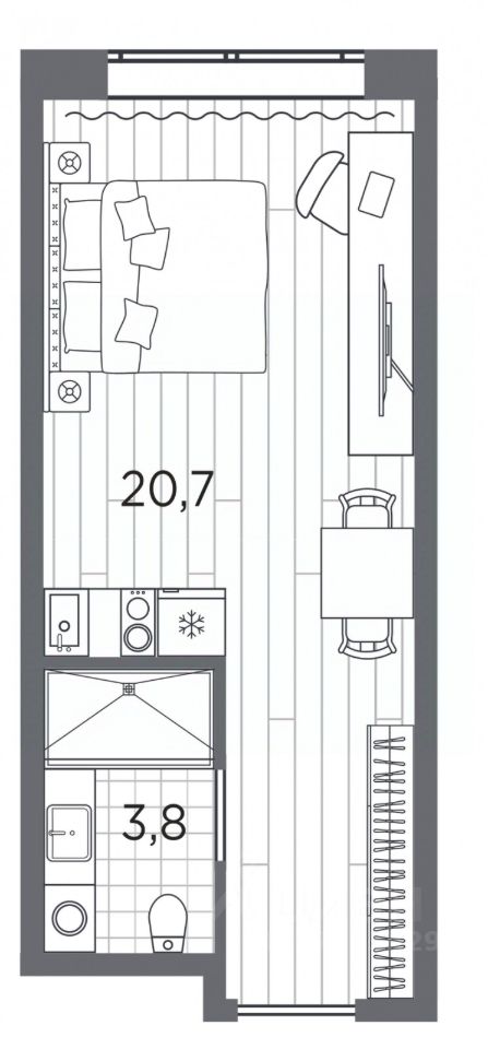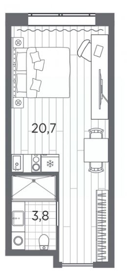 Однокомнатные апартаменты-студия с отделкой в ЖК "Industrial AVENIR" на 8 этаже. Общая площадь: 24.5 кв.м., площадь гостиной 20.7 кв.м., из которых 5 кв.м. выделено под кухонную зону. Все окна выходят на одну сторону. В апартаментах один совмещенный санузел. Высота потолков 2.5 м.