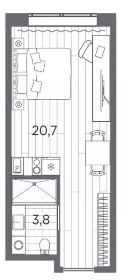 Просторные однокомнатные апартаменты-студия с отделкой в ЖК "Industrial AVENIR" на 8 этаже. Общая площадь: 24.5 кв.м., площадь гостиной 20.7 кв.м., из которых 5 кв.м. выделено под кухонную зону. Все окна выходят на одну сторону. В апартаментах один совмещенный санузел. Высота потолков 2.5 м.
