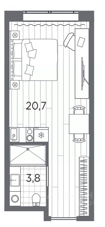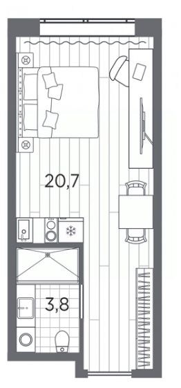 1-комн. апартаменты-студия с отделкой в ЖК "Industrial AVENIR" на 8 этаже. Общая площадь: 24.5 кв.м., площадь гостиной 20.7 кв.м., из которых 5 кв.м. выделено под кухонную зону. Все окна выходят на одну сторону. В апартаментах один совмещенный санузел. Высота потолков 2.5 м.