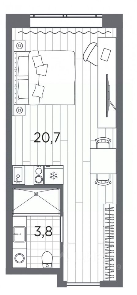 Просторные однокомнатные апартаменты-студия с отделкой в ЖК "Industrial AVENIR" на 8 этаже. Общая площадь: 24.5 кв.м., площадь гостиной 20.7 кв.м., из которых 5 кв.м. выделено под кухонную зону. Все окна выходят на одну сторону. В апартаментах один совмещенный санузел. Высота потолков 2.5 м.