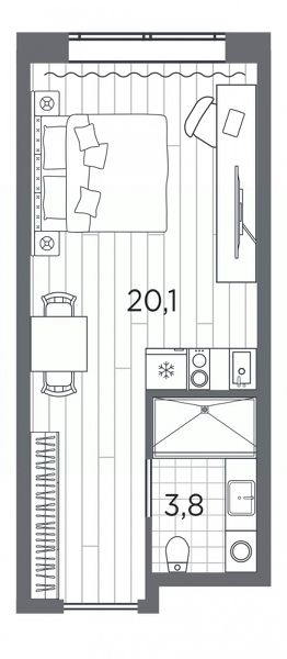 Однокомнатные апартаменты-студия с отделкой в ЖК "Industrial AVENIR" на 8 этаже. Общая площадь: 23.9 кв.м., площадь гостиной 20.1 кв.м., из которых 5 кв.м. выделено под кухонную зону. Все окна выходят на одну сторону. В апартаментах один совмещенный санузел. Высота потолков 2.5 м.