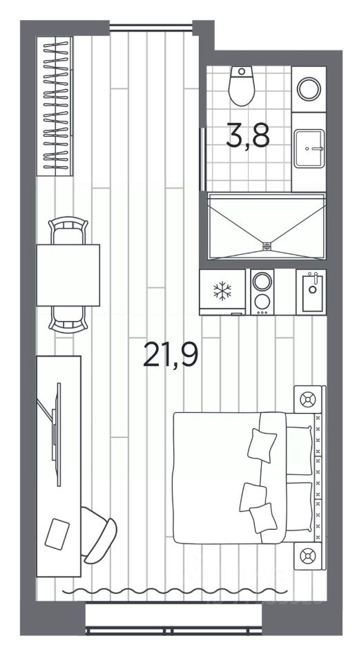 Однокомнатные апартаменты-студия от застройщика с отделкой в ЖК "Industrial AVENIR" на 8 этаже. Общая площадь: 25.7 кв.м., площадь гостиной 21.9 кв.м., из которых 5 кв.м. выделено под кухонную зону. Все окна выходят на одну сторону. В апартаментах один совмещенный санузел. Высота потолков 2.5 м.