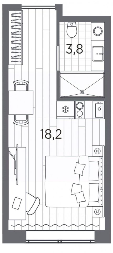1-комн. апартаменты-студия с отделкой в ЖК "Industrial AVENIR" на 8 этаже. Общая площадь: 22 кв.м., площадь гостиной 18.2 кв.м., из которых 5 кв.м. выделено под кухонную зону. Все окна выходят на одну сторону. В апартаментах один совмещенный санузел. Высота потолков 2.5 м.