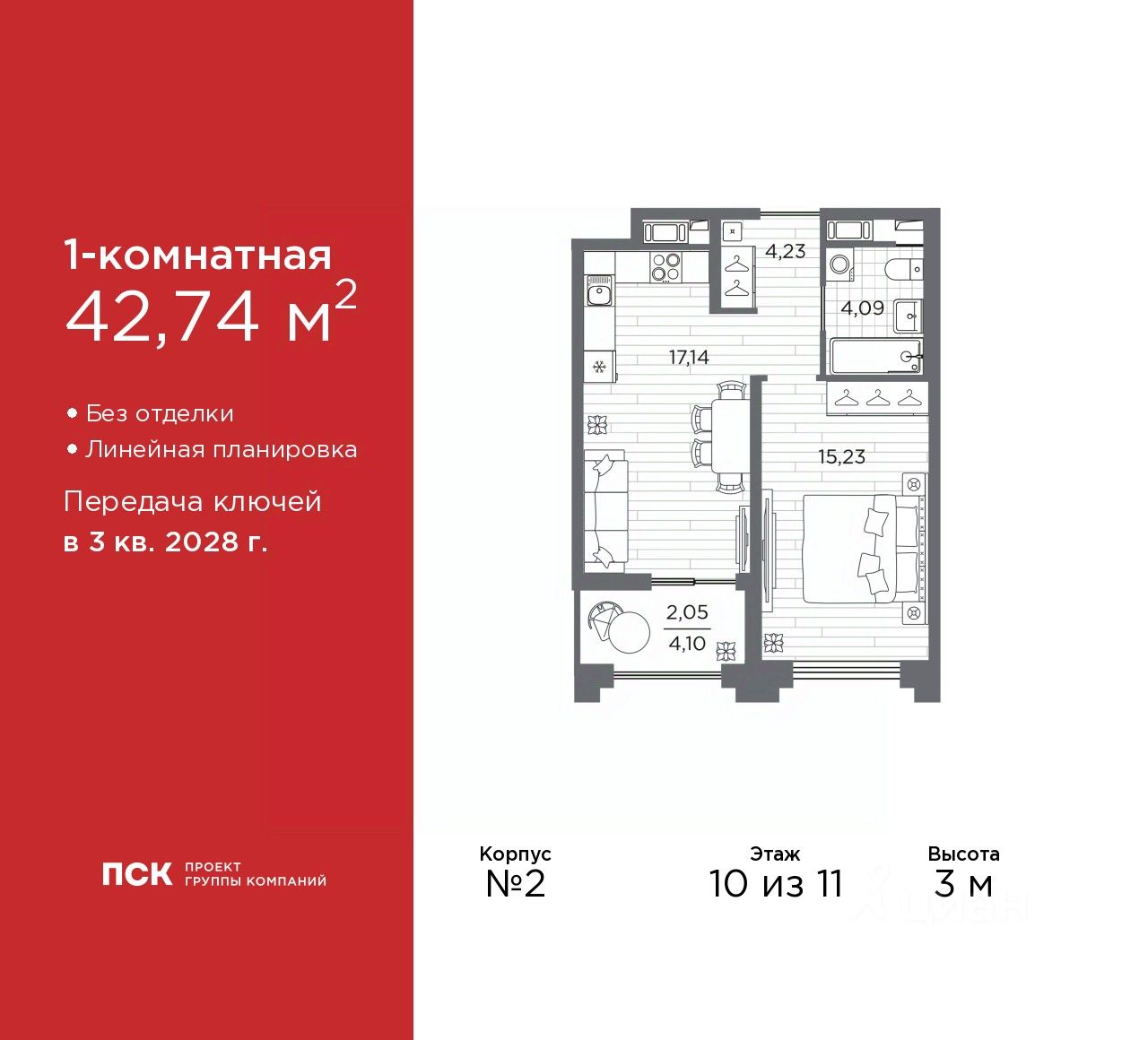 Однокомнатная квартира от застройщика в Клубный квартал "Ассамблея" на 10 этаже. Квартира без отделки, после оформления собственности можно делать ремонт. Общая площадь: 42.74 кв.м., жилая: 15.23 кв.м., площадь просторной кухни-столовой: 17.14 кв.м. Все окна выходят на одну сторону. В квартире одна лоджия, один совмещенный санузел. Высота потолков 3 м.