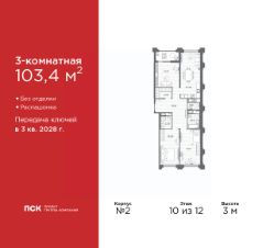 Просторная 3-комн. квартира в Клубный квартал "Ассамблея" на 10 этаже. Квартира без отделки, после оформления собственности можно делать ремонт. Общая площадь: 103.4 кв.м., жилая: 47.92 кв.м., площадь просторной кухни-столовой: 21.4 кв.м. Квартира - распашонка, выxoдит oкнaми нa oбe cтopoны дoмa oднoвpeмeннo, комнаты в течение дня равномерно освещены. В квартире одна лоджия, два совмещенных и один раздельный санузел. Высота потолков 3 м.