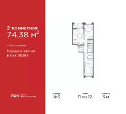 Продается двухкомнатная квартира в Клубный квартал "Ассамблея" на 11 этаже. Квартира без отделки, полностью готова к ремонту. Общая площадь: 74.38 кв.м., жилая: 32.74 кв.м., площадь просторной кухни-столовой: 18.96 кв.м. Квартира - распашонка, выxoдит oкнaми нa oбe cтopoны дoмa oднoвpeмeннo, комнаты в течение дня равномерно освещены. В квартире одна лоджия, один совмещенный и один раздельный санузел. Высота потолков 3 м.