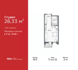 1-комн. квартира-студия в Клубный квартал "Ассамблея" на 11 этаже. Квартира без отделки, после получения ключей можно делать ремонт. Общая площадь: 28.33 кв.м., площадь гостиной 18.47 кв.м., из которых 5 кв.м. выделено под кухонную зону. Все окна выходят на одну сторону. В квартире один балкон, один совмещенный санузел. Высота потолков 3 м.