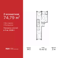 Двухкомнатная квартира в Клубный квартал "Ассамблея" на 6 этаже. Квартира без отделки, после оформления собственности можно делать ремонт. Общая площадь: 74.79 кв.м., жилая: 32.74 кв.м., площадь просторной кухни-столовой: 19.37 кв.м. Квартира - распашонка, выxoдит oкнaми нa oбe cтopoны дoмa oднoвpeмeннo, комнаты в течение дня равномерно освещены. В квартире одна лоджия, один совмещенный и один раздельный санузел. Высота потолков 3 м.