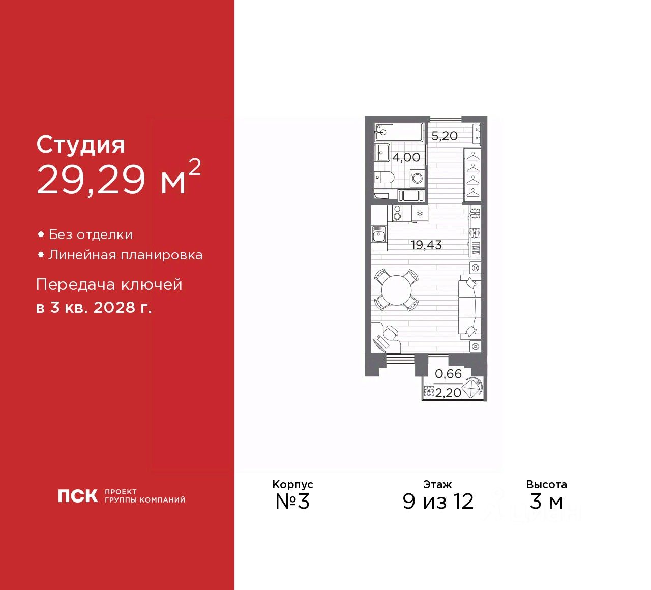 Продается однокомнатная квартира-студия от застройщика в Клубный квартал "Ассамблея" на 9 этаже. Квартира без отделки, после получения ключей можно делать ремонт. Общая площадь: 29.29 кв.м., площадь гостиной 19.43 кв.м., из которых 5 кв.м. выделено под кухонную зону. Все окна выходят на одну сторону. В квартире один балкон, один совмещенный санузел. Высота потолков 3 м.