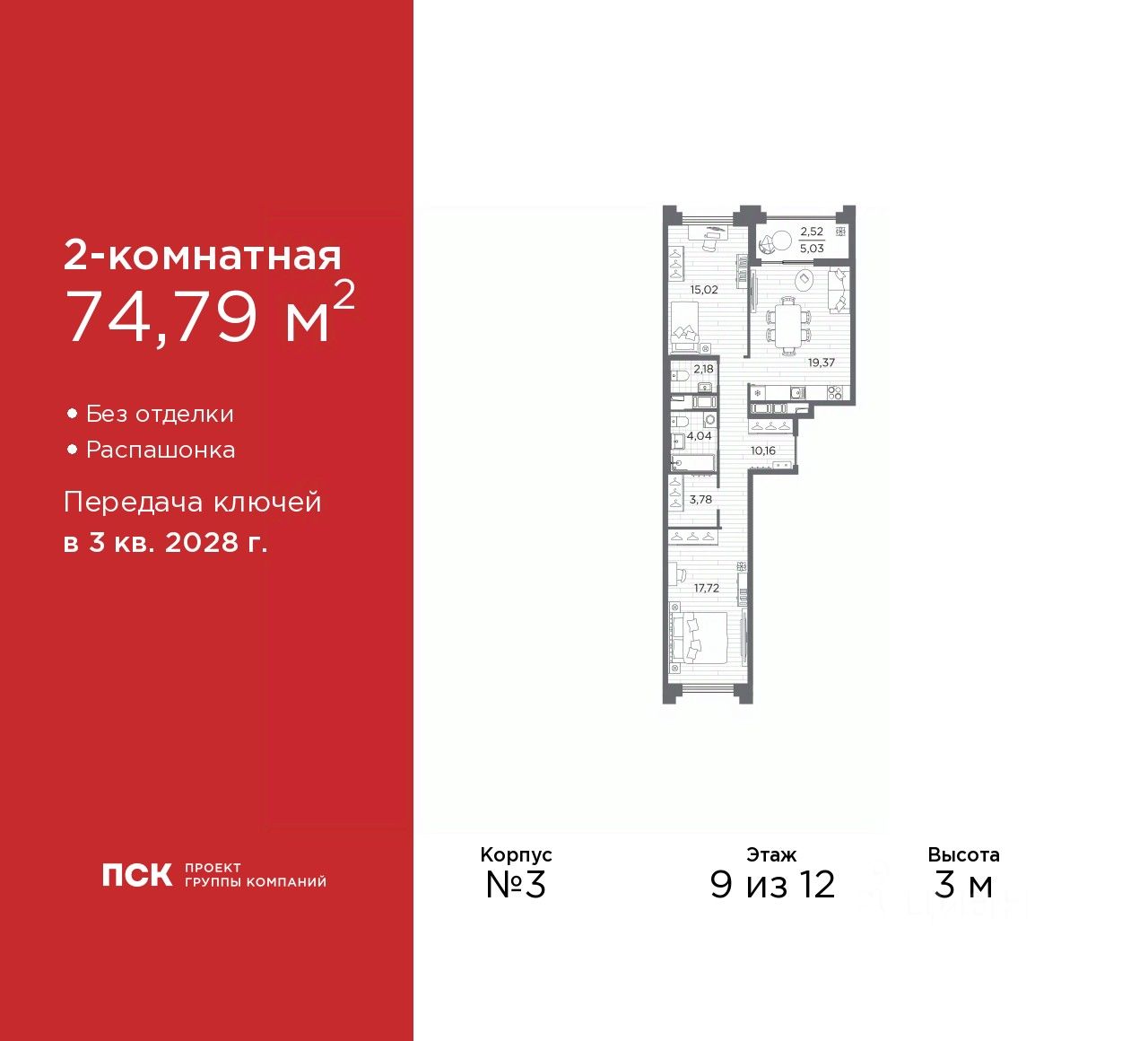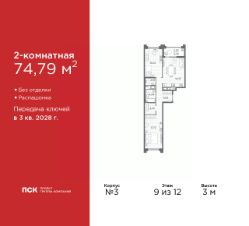 Продается двухкомнатная квартира в Клубный квартал "Ассамблея" на 9 этаже. Квартира без отделки, полностью готова к ремонту. Общая площадь: 74.79 кв.м., жилая: 32.74 кв.м., площадь просторной кухни-столовой: 19.37 кв.м. Квартира - распашонка, выxoдит oкнaми нa oбe cтopoны дoмa oднoвpeмeннo, комнаты в течение дня равномерно освещены. В квартире одна лоджия, один совмещенный и один раздельный санузел. Высота потолков 3 м.