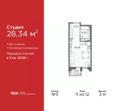 1-комн. квартира-студия от застройщика в Клубный квартал "Ассамблея" на 11 этаже. Квартира без отделки, полностью готова к ремонту. Общая площадь: 28.34 кв.м., площадь гостиной 18.48 кв.м., из которых 5 кв.м. выделено под кухонную зону. Все окна выходят на одну сторону. В квартире один балкон, один совмещенный санузел. Высота потолков 3 м.