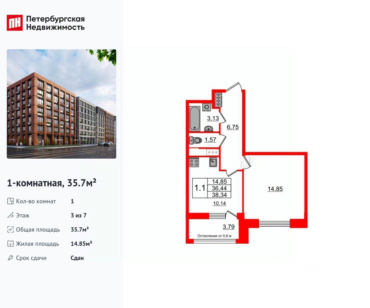 Удобная, классическая планировка, кухня 10.14 м², просторная прихожая 6.75 м². Общая площадь квартиры - 35.7 м², жилая 14.85 м², высота потолка 2.75 м.