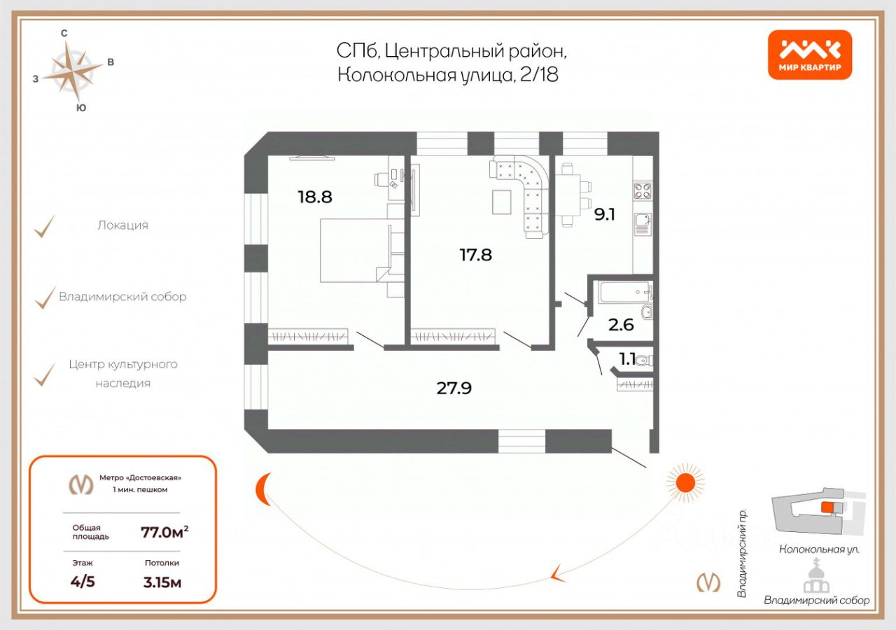 Расположенная в редкой и престижной локации напротив Владимирского собора по адресу ул. Колокольная, 2, эта светлая квартира с высокими потолками 3,15 м станет идеальным выбором для тех, кто ценит комфорт, стиль и историческую атмосферу. Парадный вход подчеркивает статусность дома, а продуманная планировка и аутентичность создают ощущение уюта и простора.