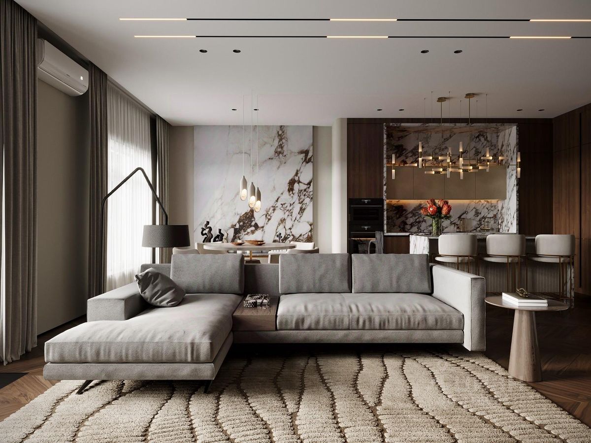 - просторная кухня-гостиная с ТВ-зоной, с шикарной оборудованной кухней с островом, обеденной зоной у окна с видом на воду. Премиальные материалы и интерьерные решения.