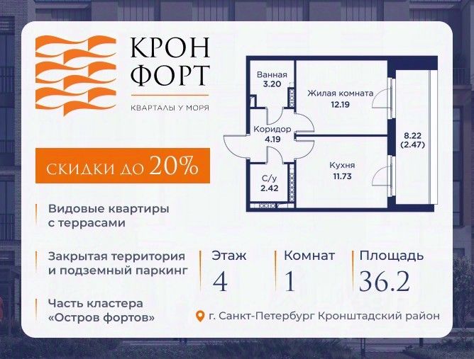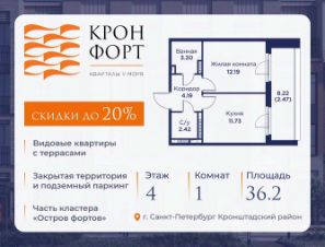 Предлагается квартира площадью 36.2 кв.м в жилом комплексе "Кронфорт. Центральный" в Санкт-Петербурге (Кронштадт). Возможна покупка с использованием льготных и специальных ипотечных программ с государственной поддержкой.
