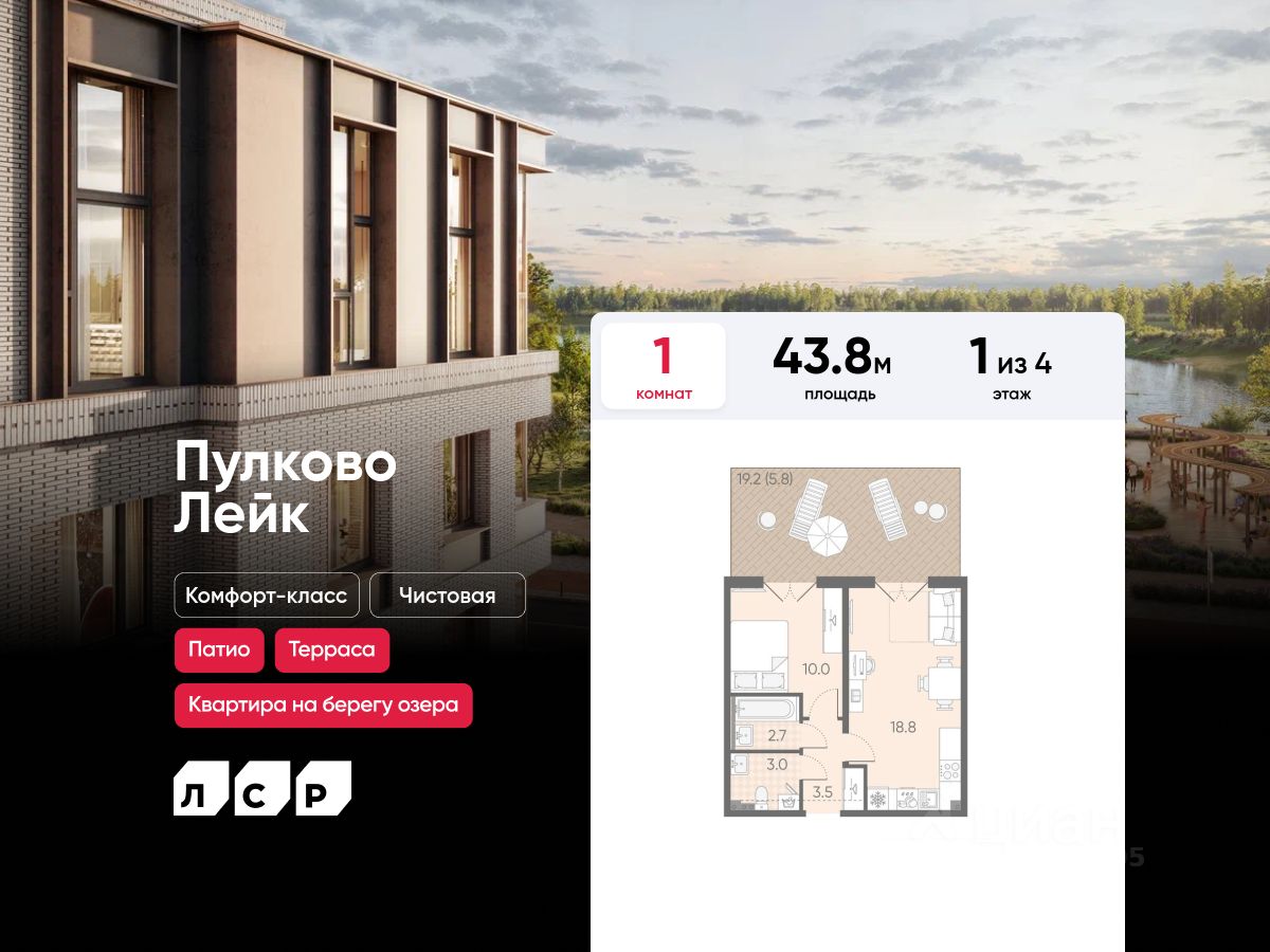 Продается 1-комнатная квартира в ЖК "Пулково Лейк" на 1 этаже. Общая площадь составляет 43.80 кв. м. Квартира с чистовой отделкой. Преимущество планировки - просторная терраса, которая создает комфорт для вашего отдыха и жизни. Жилой комплекс "Пулково Лейк" располагается по адресу Санкт-Петербург, Московский.