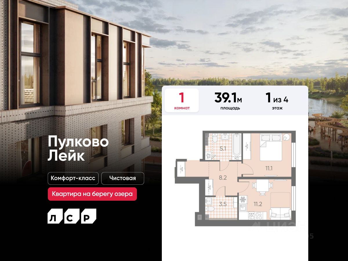 Продается 1-комнатная квартира в ЖК "Пулково Лейк" на 1 этаже. Общая площадь составляет 39.10 кв. м. Квартира с чистовой отделкой. Жилой комплекс "Пулково Лейк" располагается по адресу Санкт-Петербург, Московский.