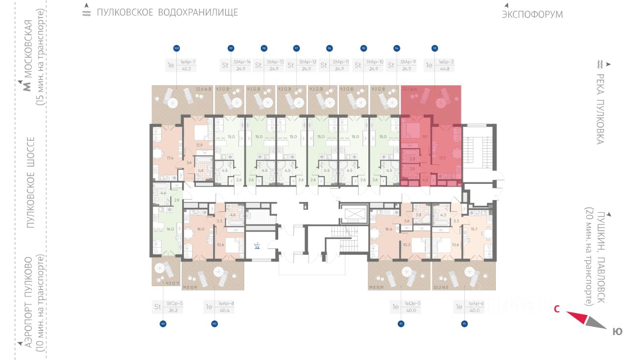 Продается 1-комнатная квартира в ЖК "Пулково Лейк" на 1 этаже. Общая площадь составляет 44.80 кв. м. Квартира с чистовой отделкой. Жилой комплекс "Пулково Лейк" располагается по адресу Санкт-Петербург, Московский.