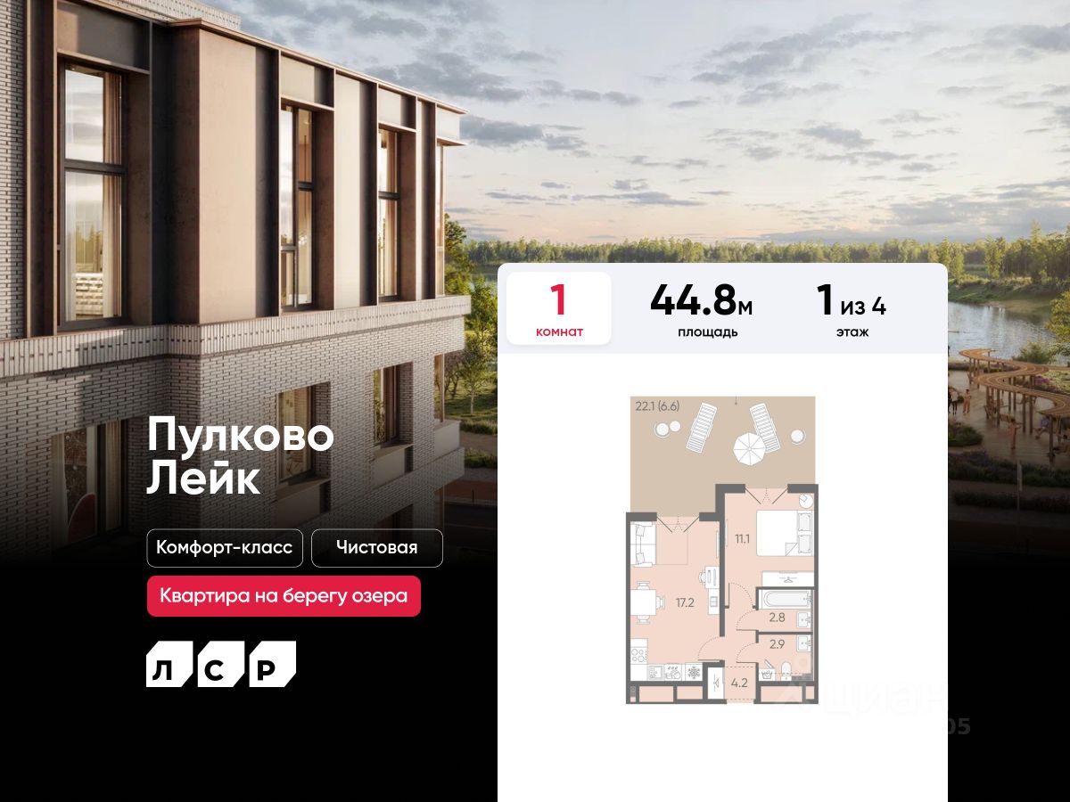 Продается 1-комнатная квартира в ЖК "Пулково Лейк" на 1 этаже. Общая площадь составляет 44.80 кв. м. Квартира с чистовой отделкой. Жилой комплекс "Пулково Лейк" располагается по адресу Санкт-Петербург, Московский.