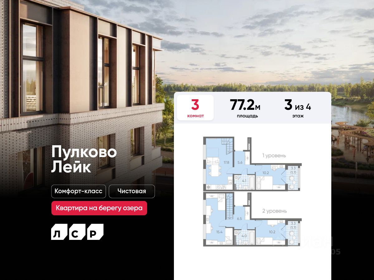 Продается 3-комнатная квартира в ЖК "Пулково Лейк" на 3 этаже. Общая площадь составляет 77.20 кв. м. Квартира с чистовой отделкой. Жилой комплекс "Пулково Лейк" располагается по адресу Санкт-Петербург, Московский.