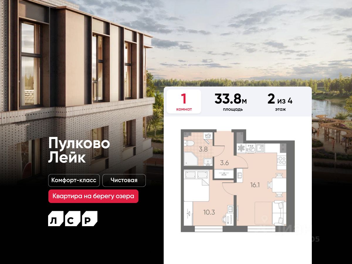 Продается 1-комнатная квартира в ЖК "Пулково Лейк" на 2 этаже. Общая площадь составляет 33.80 кв. м. Квартира с чистовой отделкой. Жилой комплекс "Пулково Лейк" располагается по адресу Санкт-Петербург, Московский.