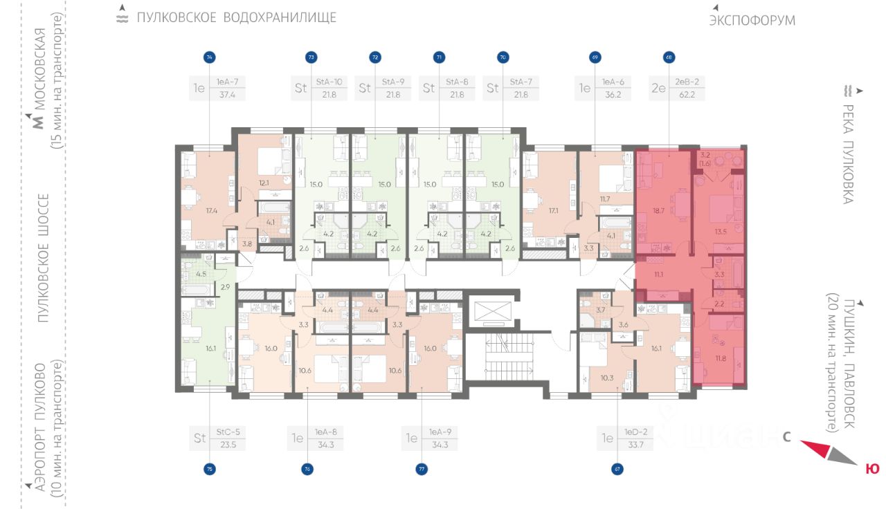Дома высотой всего 4 этажа, квартиры от уютных студий до трехкомнатных квартир для большой семьи. Широчайший выбор планировок, включая квартиры с мастер-спальнями, патио, каминами, саунами, двухуровневые квартиры. Школа, детские сады, парк на берегу озера и выезды на Пулковское и Петербургское шоссе.