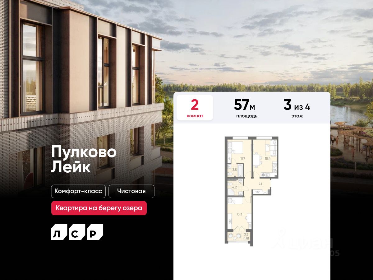 Продается 2-комнатная квартира в ЖК "Пулково Лейк" на 3 этаже. Общая площадь составляет 57.00 кв. м. Квартира с чистовой отделкой. Жилой комплекс "Пулково Лейк" располагается по адресу Санкт-Петербург, Московский.