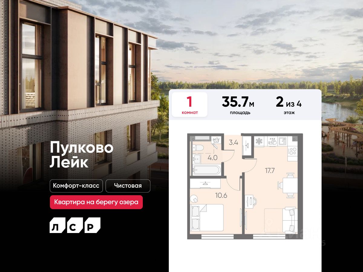 Продается 1-комнатная квартира в ЖК "Пулково Лейк" на 2 этаже. Общая площадь составляет 35.70 кв. м. Квартира с чистовой отделкой. Жилой комплекс "Пулково Лейк" располагается по адресу Санкт-Петербург, Московский.