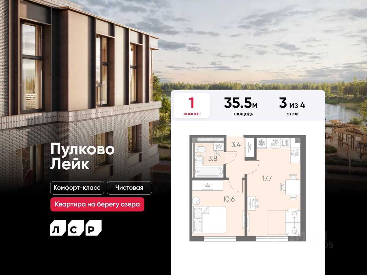 Продается 1-комнатная квартира в ЖК "Пулково Лейк" на 3 этаже. Общая площадь составляет 35.50 кв. м. Квартира с чистовой отделкой. Жилой комплекс "Пулково Лейк" располагается по адресу Санкт-Петербург, Московский.