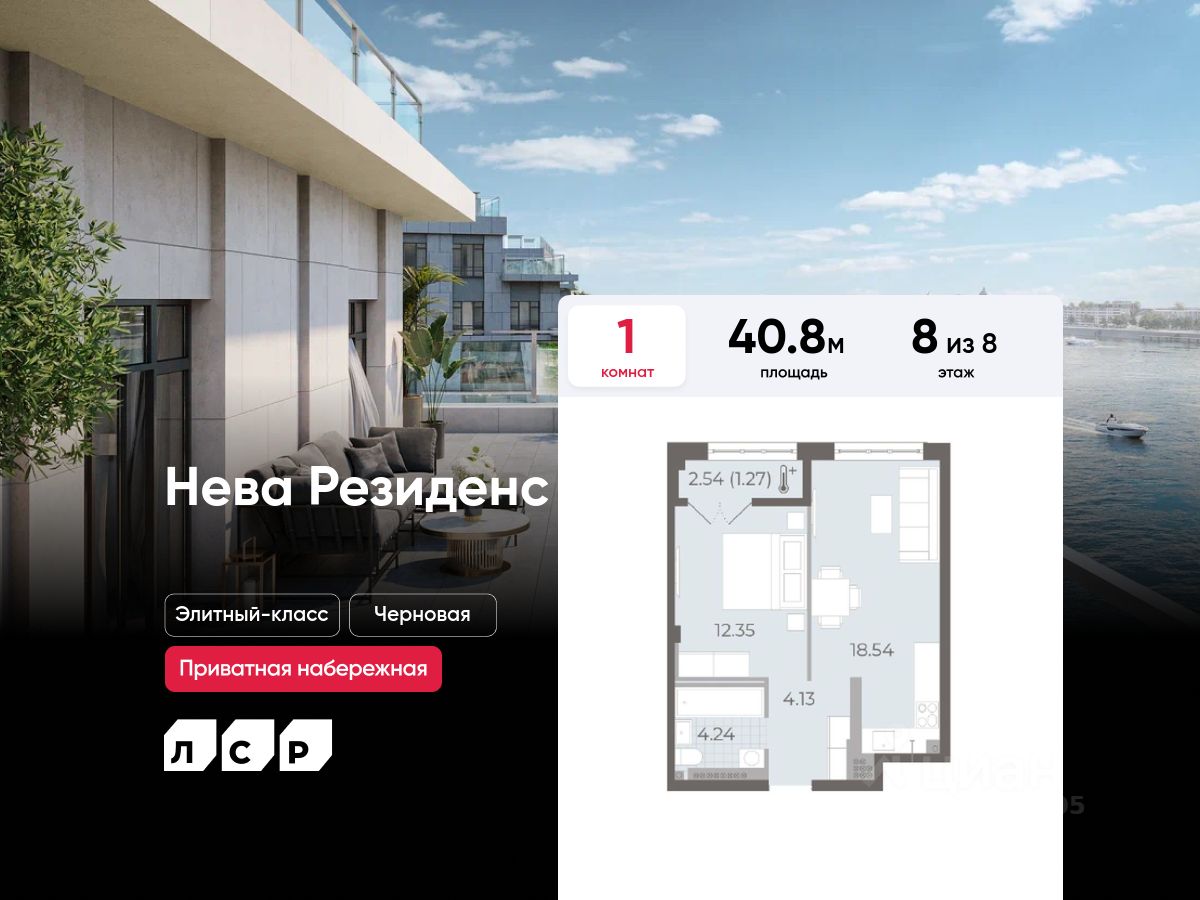 Продаётся 1-комнатная квартира в ЖК "Нева Резиденс" на 8 этаже. Общая площадь составляет 40.80 кв. м. Квартира без отделки. Жилой комплекс "Нева Резиденс" располагается по адресу Санкт-Петербург, Петроградский.