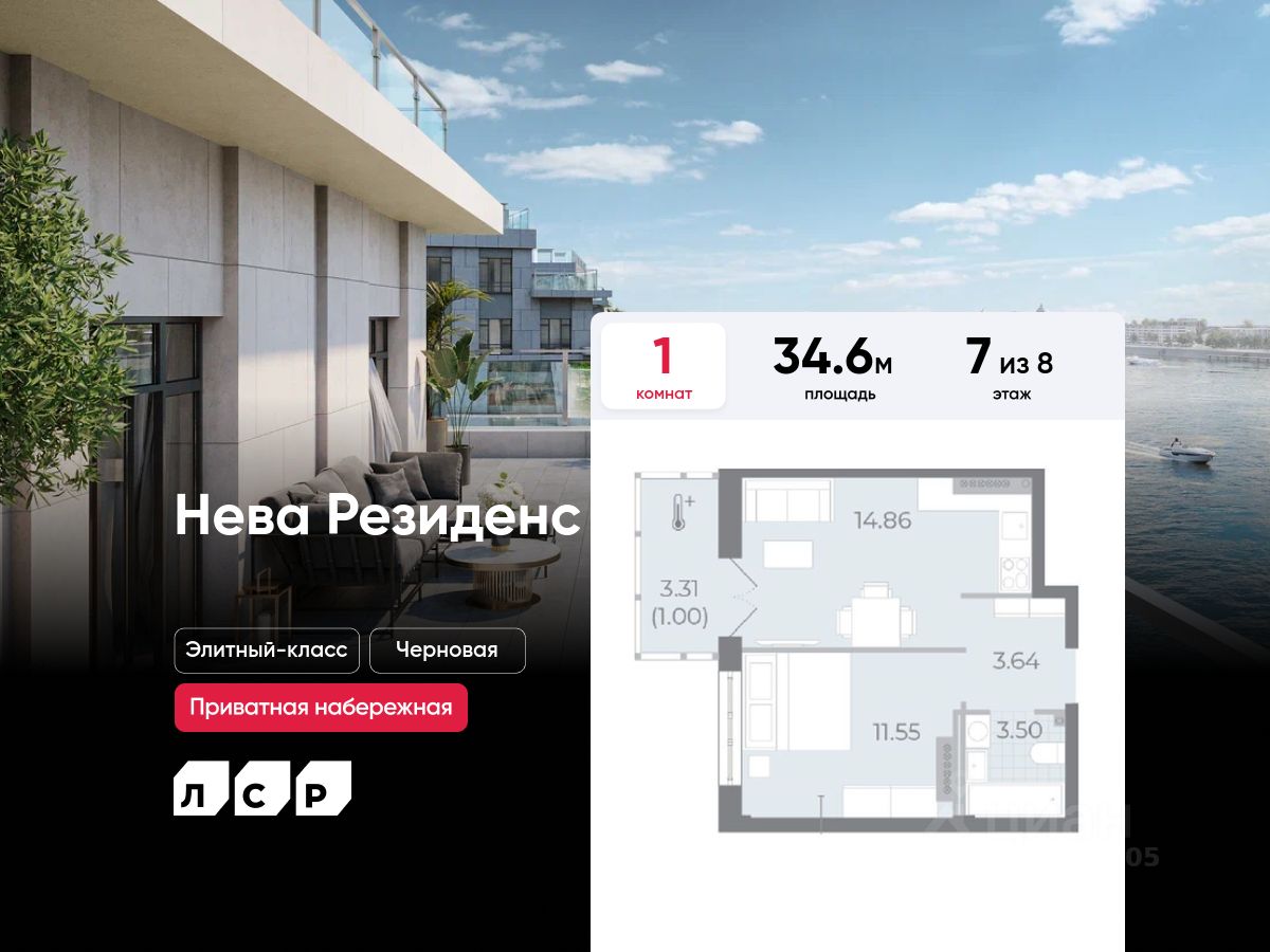 Продаётся 1-комнатная квартира в ЖК "Нева Резиденс" на 7 этаже. Общая площадь составляет 34.60 кв. м. Квартира без отделки. Жилой комплекс "Нева Резиденс" располагается по адресу Санкт-Петербург, Петроградский.