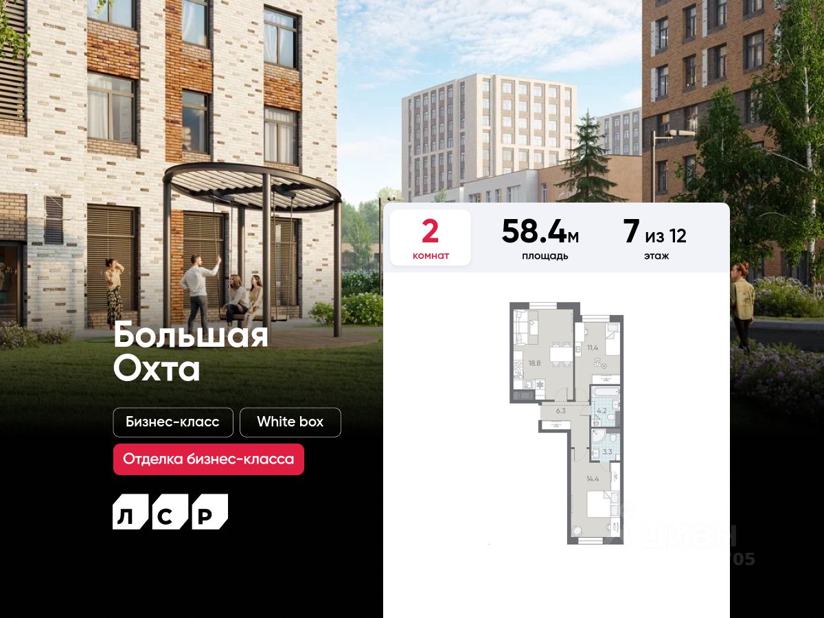 Продаётся 2-комнатная квартира в ЖК "Большая Охта" на 7 этаже. Общая площадь составляет 58.40 кв. м. Квартира с white box отделкой. Жилой комплекс "Большая Охта" располагается по адресу Санкт-Петербург, Красногвардейский.