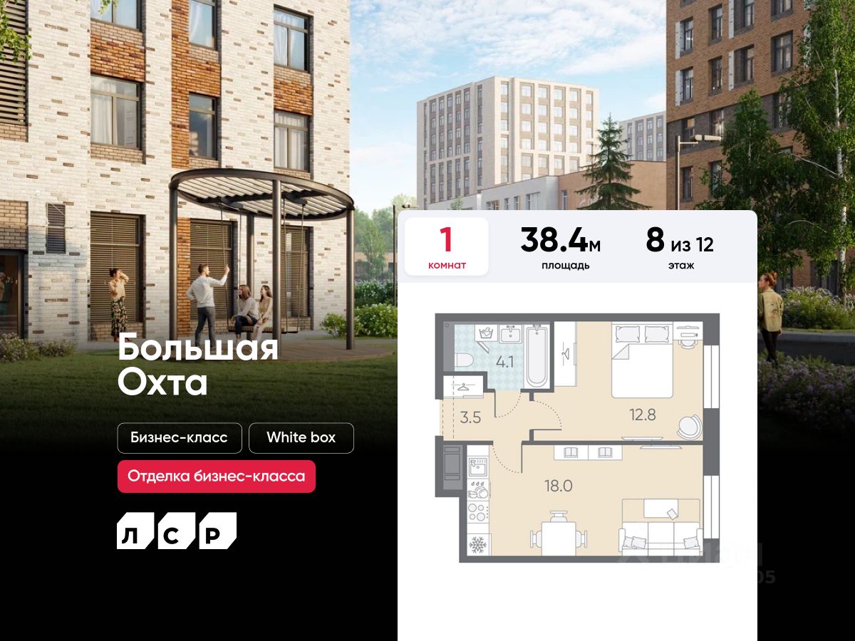 Продаётся 1-комнатная квартира в ЖК "Большая Охта" на 8 этаже. Общая площадь составляет 38.40 кв. м. Квартира с white box отделкой. Жилой комплекс "Большая Охта" располагается по адресу Санкт-Петербург, Красногвардейский.