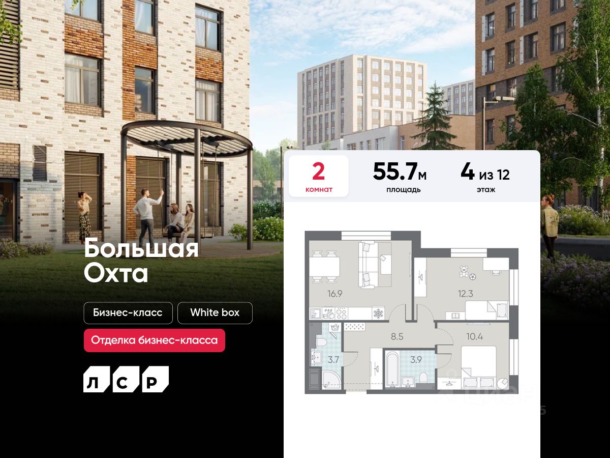 Продаётся 2-комнатная квартира в ЖК "Большая Охта" на 4 этаже. Общая площадь составляет 55.70 кв. м. Квартира с white box отделкой. Жилой комплекс "Большая Охта" располагается по адресу Санкт-Петербург, Красногвардейский.