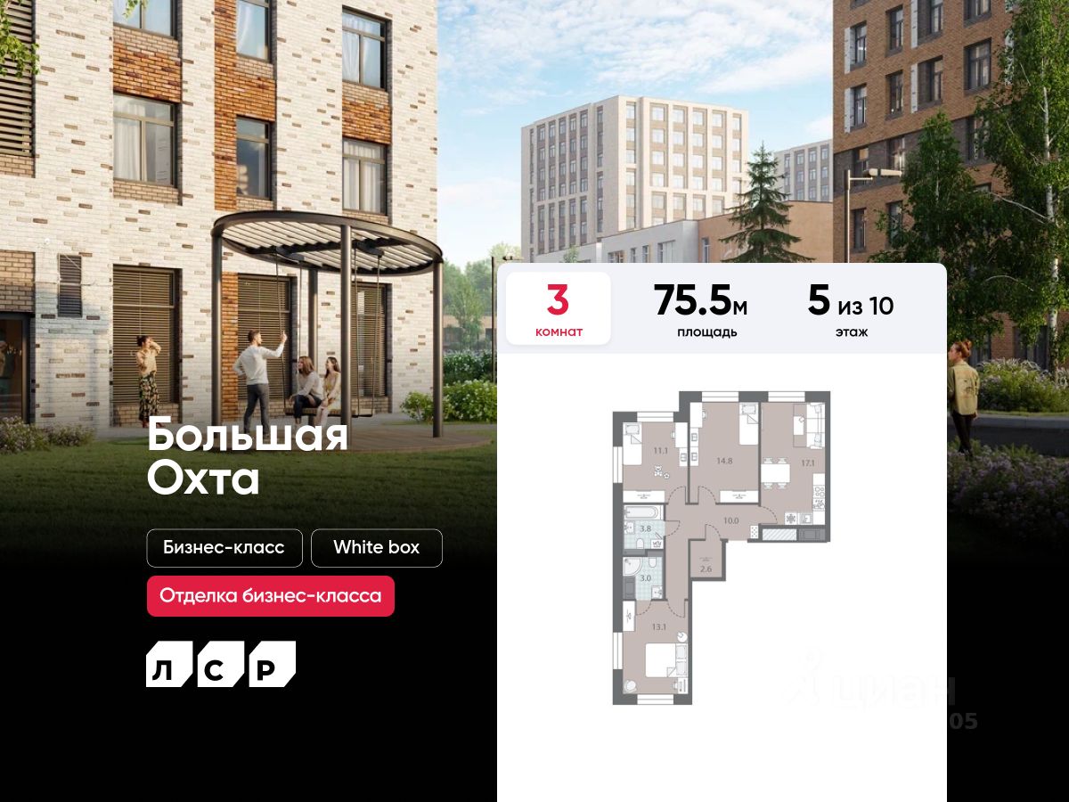 Продаётся 3-комнатная квартира в ЖК "Большая Охта" на 5 этаже. Общая площадь составляет 75.50 кв. м. Квартира с white box отделкой. Жилой комплекс "Большая Охта" располагается по адресу Санкт-Петербург, Красногвардейский.