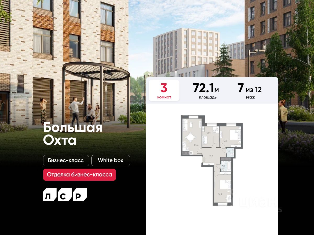 Продаётся 3-комнатная квартира в ЖК "Большая Охта" на 7 этаже. Общая площадь составляет 72.10 кв. м. Квартира с white box отделкой. Жилой комплекс "Большая Охта" располагается по адресу Санкт-Петербург, Красногвардейский.