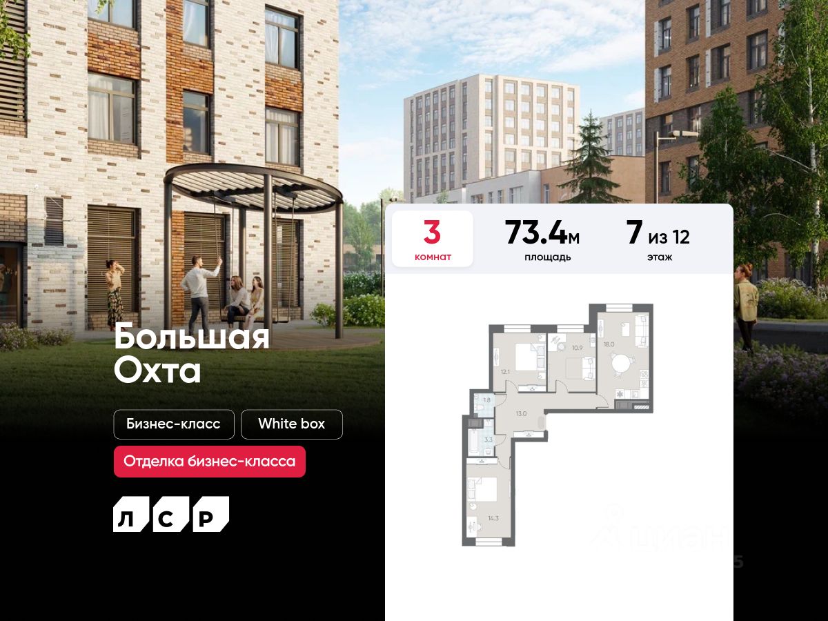 Продаётся 3-комнатная квартира в ЖК "Большая Охта" на 7 этаже. Общая площадь составляет 73.40 кв. м. Квартира с white box отделкой. Жилой комплекс "Большая Охта" располагается по адресу Санкт-Петербург, Красногвардейский.