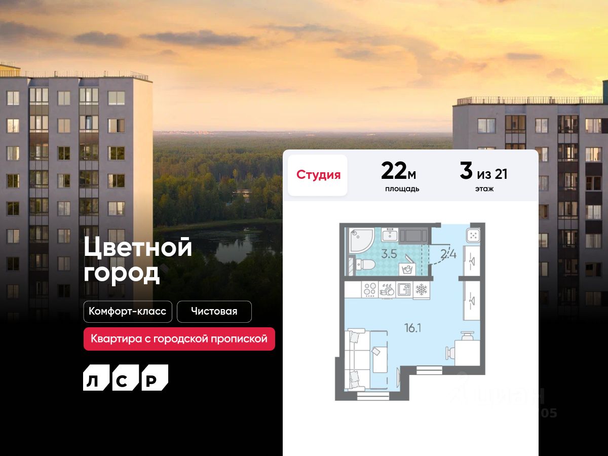 Продается студия в ЖК "Цветной город" на 3 этаже. Общая площадь составляет 22.00 кв. м. Квартира с чистовой отделкой Срок сдачи дома: 3 квартал 2026. Жилой комплекс "Цветной город" располагается по адресу Санкт-Петербург, Красногвардейский.