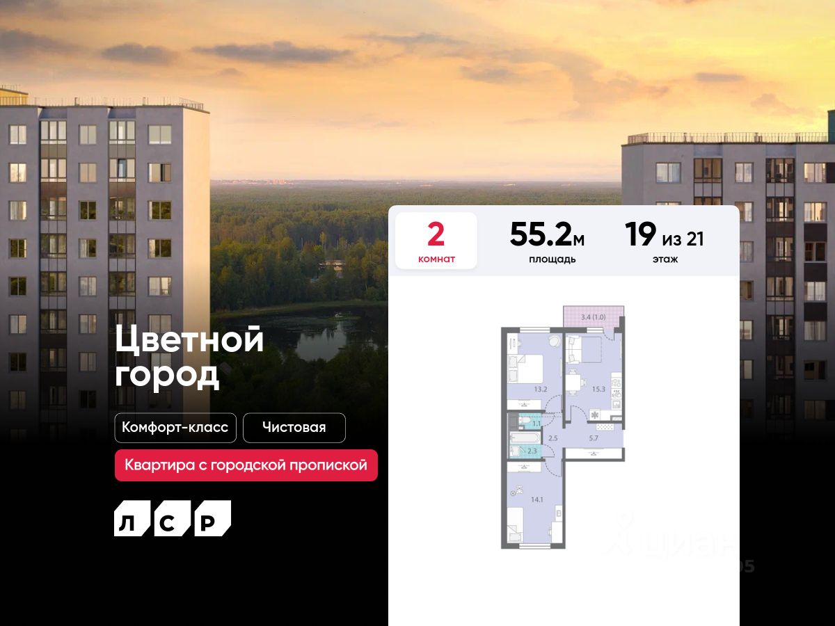 Продается 2-комнатная квартира в ЖК "Цветной город" на 19 этаже. Общая площадь составляет 55.20 кв. м. Квартира с чистовой отделкой Срок сдачи дома: 3 квартал 2026. Жилой комплекс "Цветной город" располагается по адресу Санкт-Петербург, Красногвардейский.