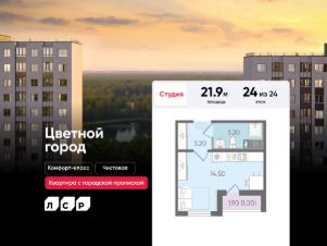 Продается студия в ЖК "Цветной город" на 24 этаже. Общая площадь составляет 21.90 кв. м. Квартира с чистовой отделкой Срок сдачи дома: 4 квартал 2025. Жилой комплекс "Цветной город" располагается по адресу Санкт-Петербург, Красногвардейский.
