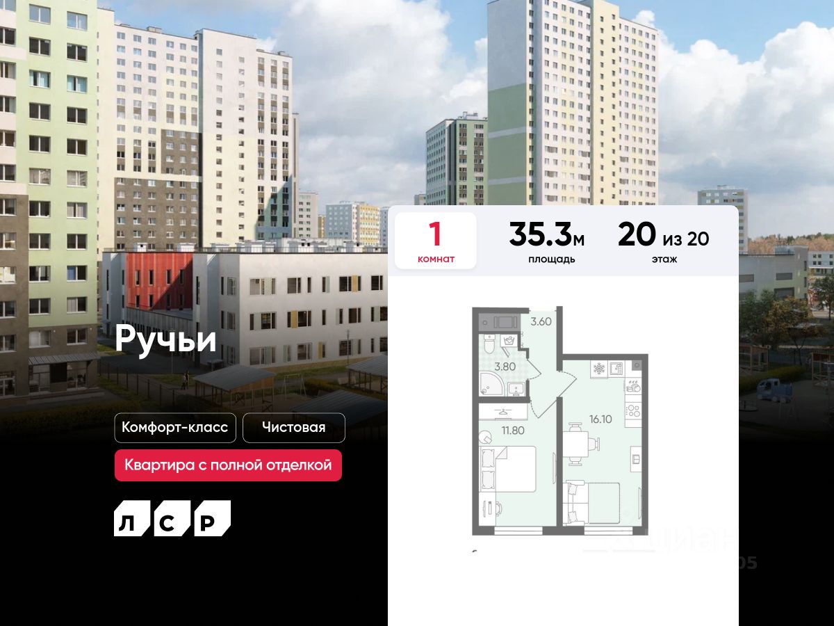 Продаётся 1-комнатная квартира в ЖК "Ручьи" на 20 этаже. Общая площадь составляет 35.30 кв. м. Квартира с чистовой отделкой. Жилой комплекс "Ручьи" располагается по адресу Санкт-Петербург, Красногвардейский.